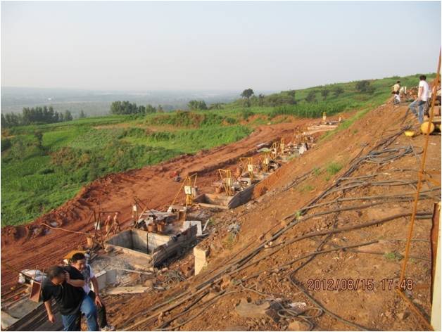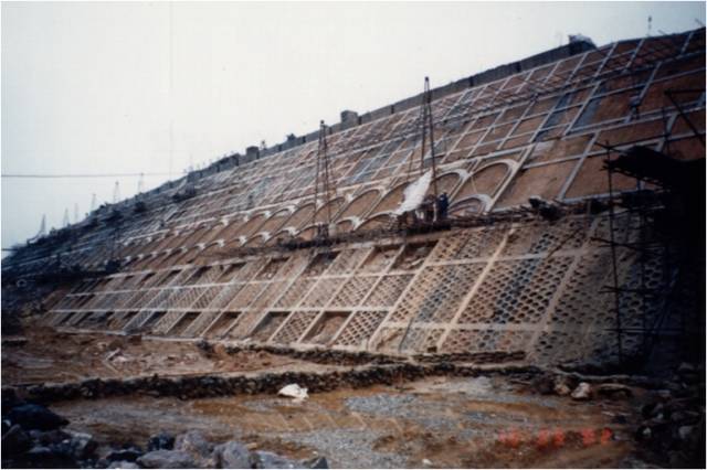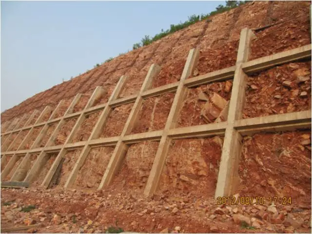 △锚索框架梁锚杆加固适用于土质、岩质地层边坡加固,锚固段应置于稳定的地层中。A、预应力锚杆:预应力锚杆同预应力锚索类似,只不过它的杆体材料为精轧螺纹钢筋或普通预应力钢筋,而锚索杆体材料采用的是预应力钢绞线、钢丝。但预应力锚杆提供的锚固力和锚杆长度不及锚索大、长。由于锚杆是刚性体,锚杆长度太长很难施工,一般最大不超过20米(部分施工单位建议不要超过15米)。锚杆同锚索一样,一般与格子梁(框架梁)、地梁等支挡结构组合使用。